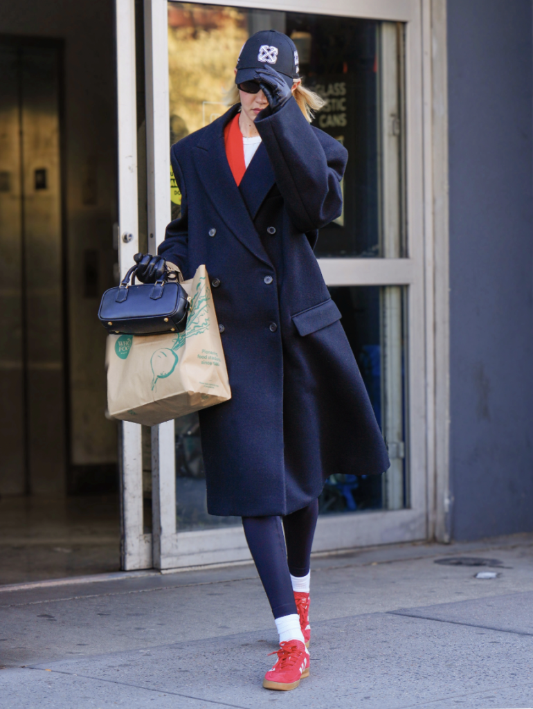 A matching tracksuit under a trench is nothing new but it’s a Princess Diana-coded classic that won’t date. And if you’ve ever wondered why WardrobeNYC keeps repeating the ‘could be a yoga-pant’ + white tee + blazer + knit + cap look, it’s because it works.