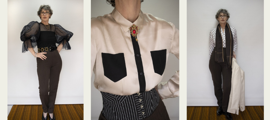 Wearing the same pants and this stunning Hugo Boss silk shirt which I thrifted. I added the beautiful brooch which belonged to a close friend’s Mum, and this fab Chantal Thomass cincher. I’m loving these Sandler ‘90s square-toed boots with just about everything right now!