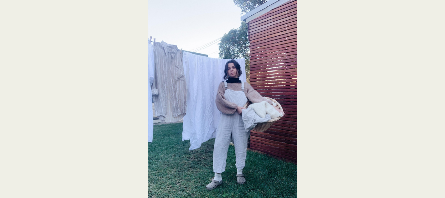 “My mom has always worn natural fibre clothing in loose, flowy silhouettes. In my teens and early ‘20s on a journey to find my own way, I experimented with many different styles, often following fleeting trends. Steadfastly, but somewhat subconsciously rejecting her way of dressing. As I grew and evolved, I naturally began to replicate her effortless vibe often borrowing things from her closet. These linen overalls from the ‘90s layered with a hand-knit jumper (made by her) are something she would’ve worn regularly in her ‘30s, inadvertently teaching me to look stylish in the most comfortable way.”