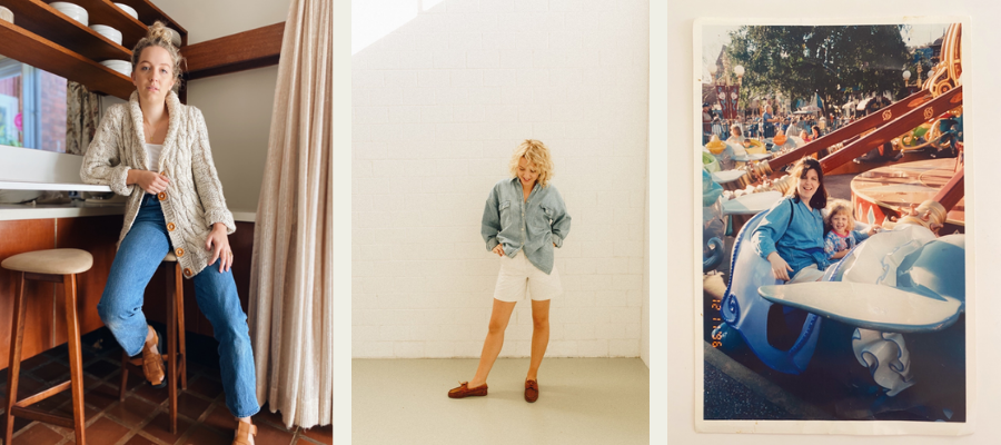 “In true Canadian fashion, my mum was an avid denim-on-denim wearer in the ’90s. I have fond memories of her in full-length denim overalls, paintbrush tucked into her ponytail, flecks of paint dotting her fringe. I would give anything for those overalls – paint stains and all. I did manage to steal this denim shirt (possibly from my dad circa 1998) and have loved it for many years, in many places and seasons. An oversized denim shirt makes for an easy denim-on-white look in summer, as you can see my mum absolutely rocking at Disney World in ’96, or a classic ‘mum hits the park’ denim-on-denim look with matchy vintage Levi’s and tennis shoes.